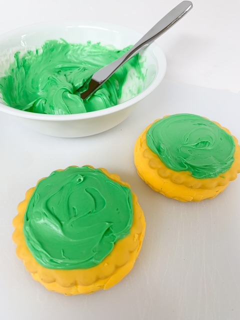 First frost the top of the moon pies with green buttercream frosting. You can use any flavor for the moon pies, I like the banana ones, but the chocolate moon pies are great too!